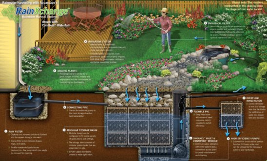 The Aquascape RainXchangeTM Harvesting Systems are a revolutionary design that combines a recirculating decorative water feature with a sub-surface rainwater harvesting collection system.